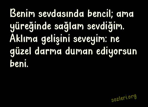 Benim sevdasında bencil; ama yüreğinde sağlam sevdiğim. Aklıma gelişini seveyim: ne güzel darma duman ediyorsun beni. ( Nazım Hikmet Aşk )