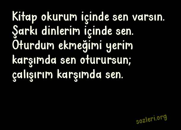 Kitap okurum içinde sen varsın. Şarkı dinlerim içinde sen. Oturdum ekmeğimi yerim karşımda sen oturursun; çalışırım karşımda sen. ( Nazım Hikmet Aşk )