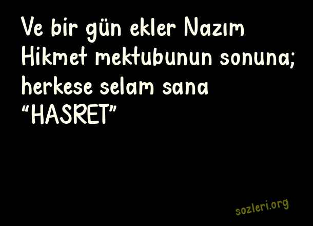 Ve bir gün - Nazım Hikmet Aşk Sözleri .. Ve bir gün ekler Nazım Hikmet mektubunun sonuna; herkese selam sana “HASRET” ( Nazım Hikmet Aşk )