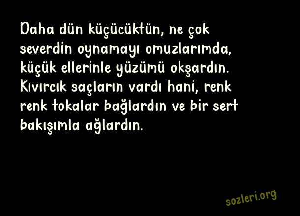 Daha dün küçücüktün, ne çok severdin oynamayı omuzlarımda, küçük ellerinle yüzümü okşardın. Kıvırcık saçların vardı hani, renk renk tokalar bağlardın ve bir sert bakışımla ağlardın. ( Anneden Kızına Güzel Sözler )