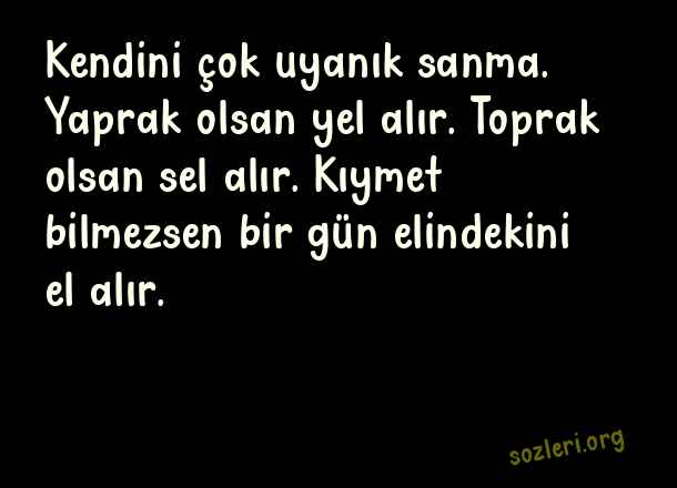 Kendini çok uyanık sanma. Yaprak olsan yel alır. Toprak olsan sel alır. Kıymet bilmezsen bir gün elindekini el alır. ( Kendini Uyanık Zannedenlere Sözler )