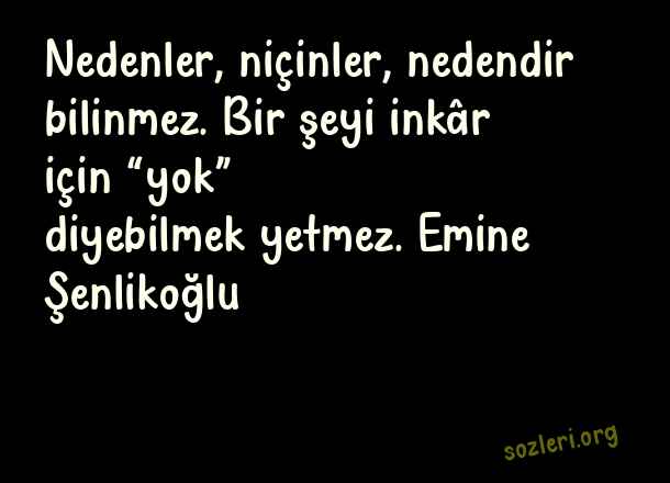 Nedenler, niçinler, nedendir bilinmez. Bir şeyi inkâr için “yok” diyebilmek yetmez. Emine Şenlikoğlu ( Neden )