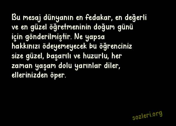 Bu mesaj dünyanın en fedakar, en değerli ve en güzel öğretmeninin doğum günü için gönderilmiştir. Ne yapsa hakkınızı ödeyemeyecek bu öğrenciniz size güzel, başarılı ve huzurlu, her zaman yaşam dolu yarınlar diler, ellerinizden öper. ( Öğretmene Doğum Günü )