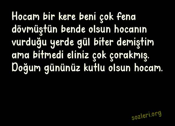 Hocam bir kere beni çok fena dövmüştün bende olsun hocanın vurduğu yerde gül biter demiştim ama bitmedi eliniz çok çorakmış. Doğum gününüz kutlu olsun hocam. ( Öğretmene Doğum Günü )