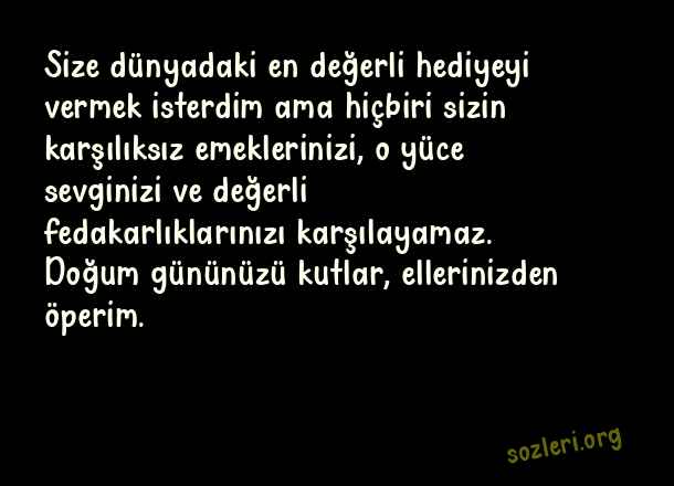 Size dünyadaki en değerli hediyeyi vermek isterdim ama hiçbiri sizin karşılıksız emeklerinizi, o yüce sevginizi ve değerli fedakarlıklarınızı karşılayamaz. Doğum gününüzü kutlar, ellerinizden öperim. ( Öğretmene Doğum Günü )