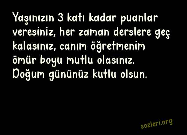 Yaşınızın 3 katı kadar puanlar veresiniz, her zaman derslere geç kalasınız, canım öğretmenim ömür boyu mutlu olasınız. Doğum gününüz kutlu olsun. ( Öğretmene Doğum Günü )