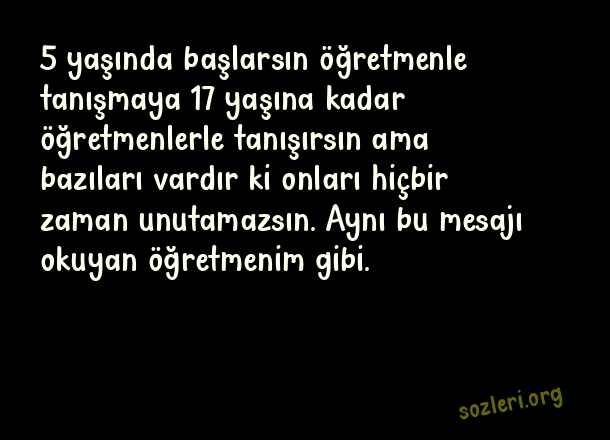 5 yaşında başlarsın öğretmenle tanışmaya 17 yaşına kadar öğretmenlerle tanışırsın ama bazıları vardır ki onları hiçbir zaman unutamazsın. Aynı bu mesajı okuyan öğretmenim gibi. ( Öğretmene Teşekkür )