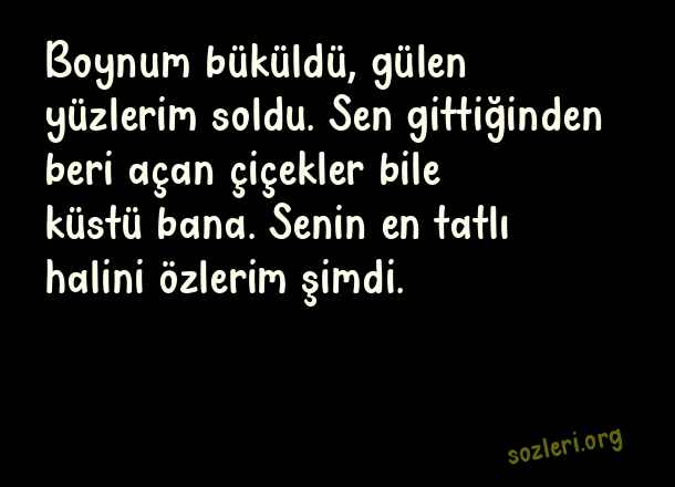 Boynum büküldü, gülen yüzlerim soldu. Sen gittiğinden beri açan çiçekler bile küstü bana. Senin en tatlı halini özlerim şimdi. ( Ölen Kişiye Özlem )