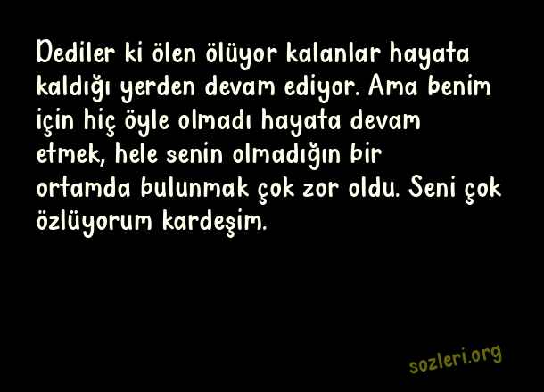 Dediler ki ölen ölüyor kalanlar hayata kaldığı yerden devam ediyor. Ama benim için hiç öyle olmadı hayata devam etmek, hele senin olmadığın bir ortamda bulunmak çok zor oldu. Seni çok özlüyorum kardeşim. ( Ölen Kişiye Özlem )