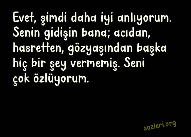 Evet, şimdi daha iyi anlıyorum. Senin gidişin bana; acıdan, hasretten, gözyaşından başka hiç bir şey vermemiş. Seni çok özlüyorum. ( Ölen Kişiye Özlem )