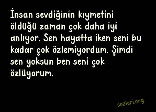 İnsan sevdiğinin kıymetini öldüğü zaman çok daha iyi anlıyor. Sen hayatta iken seni bu kadar çok özlemiyordum. Şimdi sen yoksun ben seni çok özlüyorum. ( Ölen Kişiye Özlem )