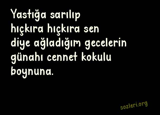 Yastığa sarılıp hıçkıra hıçkıra sen diye ağladığım gecelerin günahı cennet kokulu boynuna. ( Ölen Kişiye Özlem )