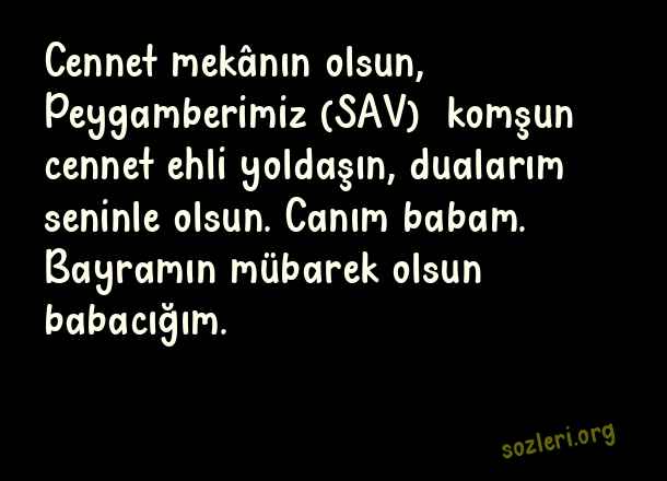 Cennet mekânın olsun, Peygamberimiz (SAV) komşun cennet ehli yoldaşın, dualarım seninle olsun. Canım babam. Bayramın mübarek olsun babacığım. ( Ölmüş Babaya Bayram )