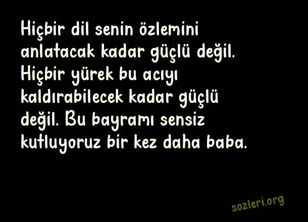Hiçbir dil senin özlemini anlatacak kadar güçlü değil. Hiçbir yürek bu acıyı kaldırabilecek kadar güçlü değil. Bu bayramı sensiz kutluyoruz bir kez daha baba. ( Ölmüş Babaya Bayram )