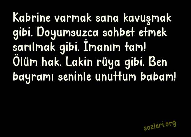 Kabrine varmak sana kavuşmak gibi. Doyumsuzca sohbet etmek sarılmak gibi. İmanım tam! Ölüm hak. Lakin rüya gibi. Ben bayramı seninle unuttum babam! ( Ölmüş Babaya Bayram )