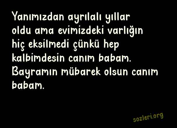 Yanımızdan ayrılalı yıllar oldu ama evimizdeki varlığın hiç eksilmedi çünkü hep kalbimdesin canım babam. Bayramın mübarek olsun canım babam. ( Ölmüş Babaya Bayram )