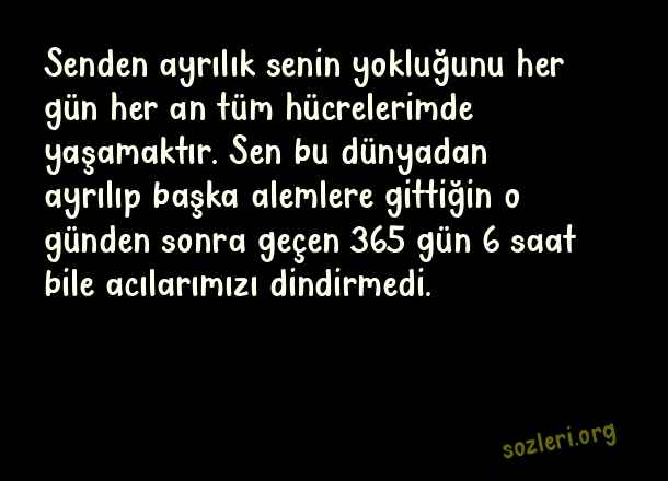 Senden ayrılık senin yokluğunu her gün her an tüm hücrelerimde yaşamaktır. Sen bu dünyadan ayrılıp başka alemlere gittiğin o günden sonra geçen 365 gün 6 saat bile acılarımızı dindirmedi. ( Ölüm Yıldönümü )