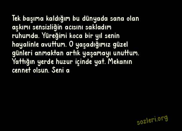 Tek başıma kaldığım bu dünyada sana olan aşkımı sensizliğin acısını sakladım ruhumda. Yüreğimi koca bir yıl senin hayalinle avuttum. O yaşadığımız güzel günleri anmaktan artık yaşamayı unuttum. Yattığın yerde huzur içinde yat. Mekanın cennet olsun. Seni a ( Ölüm Yıldönümü )