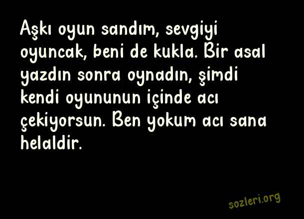 Aşkı oyun sandım, sevgiyi oyuncak, beni de kukla. Bir asal yazdın sonra oynadın, şimdi kendi oyununun içinde acı çekiyorsun. Ben yokum acı sana helaldir. ( Oyuncak )