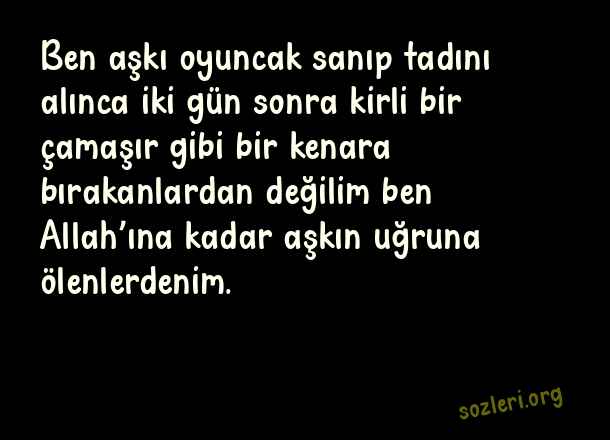 Ben aşkı oyuncak sanıp tadını alınca iki gün sonra kirli bir çamaşır gibi bir kenara bırakanlardan değilim ben Allah’ına kadar aşkın uğruna ölenlerdenim. ( Oyuncak )