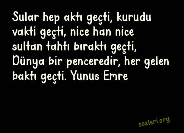 Sular hep aktı geçti, kurudu vakti geçti, nice han nice sultan tahtı bıraktı geçti, Dünya bir penceredir, her gelen baktı geçti. Yunus Emre ( Pencere )