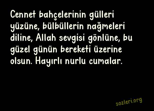Cennet bahçelerinin gülleri yüzüne, bülbüllerin nağmeleri diline, Allah sevgisi gönlüne, bu güzel günün bereketi üzerine olsun. Hayırlı nurlu cumalar. ( Perşembe Gecesi )