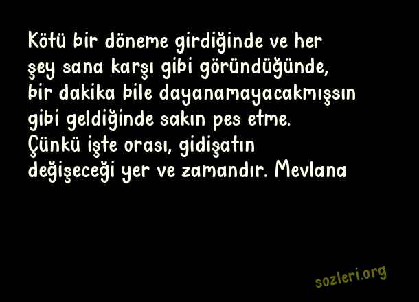 Kötü bir döneme girdiğinde ve her şey sana karşı gibi göründüğünde, bir dakika bile dayanamayacakmışsın gibi geldiğinde sakın pes etme. Çünkü işte orası, gidişatın değişeceği yer ve zamandır. Mevlana ( Pes Etmemek )