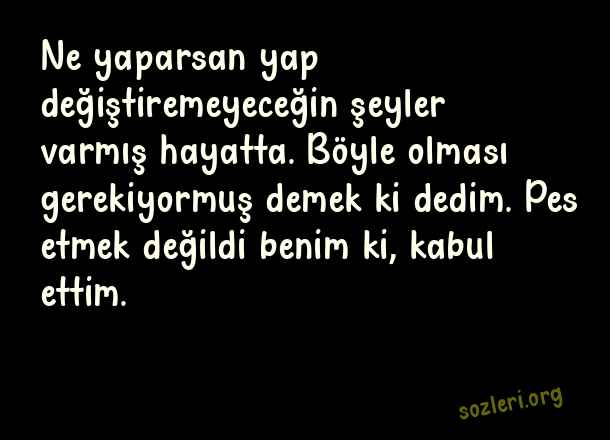 Ne yaparsan yap değiştiremeyeceğin şeyler varmış hayatta. Böyle olması gerekiyormuş demek ki dedim. Pes etmek değildi benim ki, kabul ettim. ( Pes Etmemek )