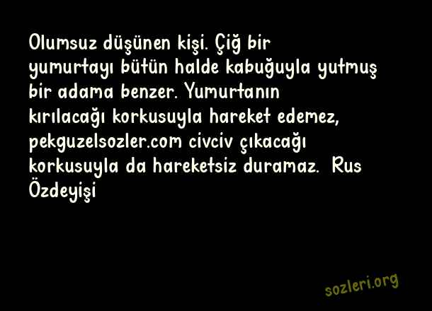 Olumsuz düşünen kişi. Çiğ bir yumurtayı bütün halde kabuğuyla yutmuş bir adama benzer. Yumurtanın kırılacağı korkusuyla hareket edemez, civciv çıkacağı korkusuyla da hareketsiz duramaz. Rus Özdeyişi ( Pes Etmemek )