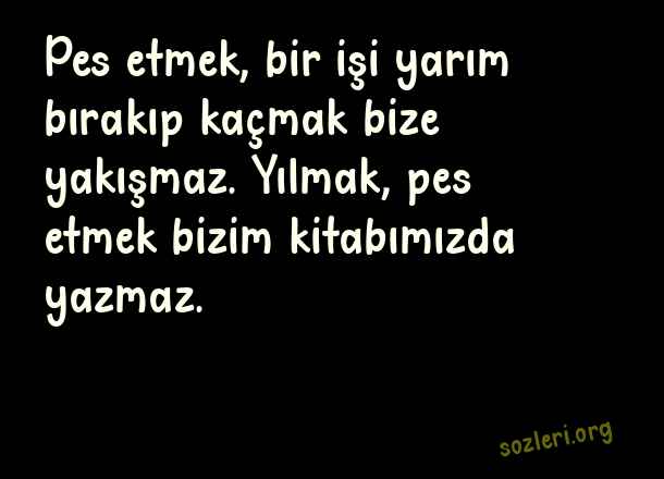 Pes etmek, bir işi yarım bırakıp kaçmak bize yakışmaz. Yılmak, pes etmek bizim kitabımızda yazmaz. ( Pes Etmemek )