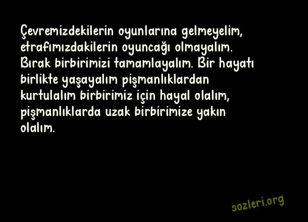 Çevremizdekilerin oyunlarına gelmeyelim, etrafımızdakilerin oyuncağı olmayalım. Bırak birbirimizi tamamlayalım. Bir hayatı birlikte yaşayalım pişmanlıklardan kurtulalım birbirimiz için hayal olalım, pişmanlıklarda uzak birbirimize yakın olalım. ( Pişmanlık )