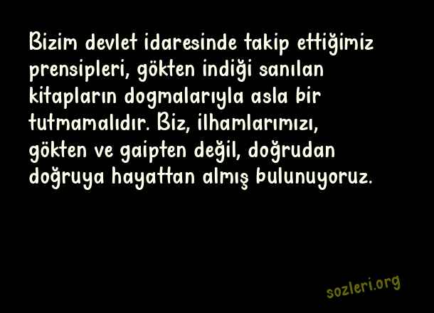 Bizim devlet idaresinde takip ettiğimiz prensipleri, gökten indiği sanılan kitapların dogmalarıyla asla bir tutmamalıdır. Biz, ilhamlarımızı, gökten ve gaipten değil, doğrudan doğruya hayattan almış bulunuyoruz. ( Prensip )