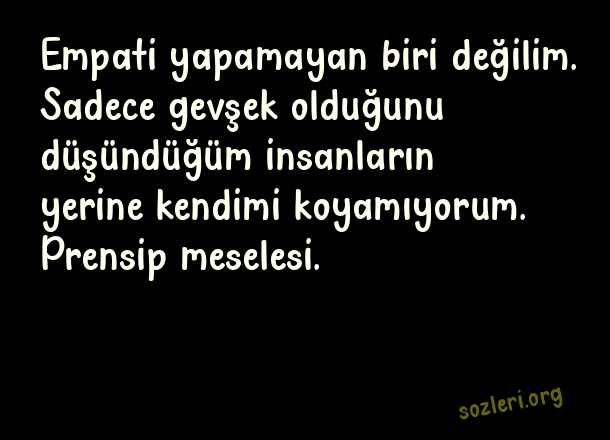 Empati yapamayan biri değilim. Sadece gevşek olduğunu düşündüğüm insanların yerine kendimi koyamıyorum. Prensip meselesi. ( Prensip )