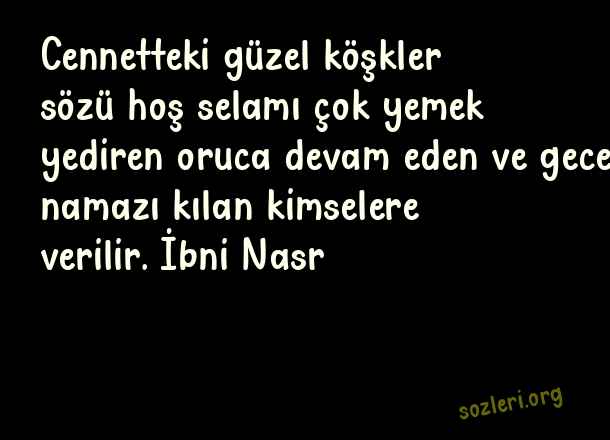 Cennetteki güzel köşkler sözü hoş selamı çok yemek yediren oruca devam eden ve gece namazı kılan kimselere verilir. İbni Nasr ( Ramazan İle İlgili Güzel Sözler )