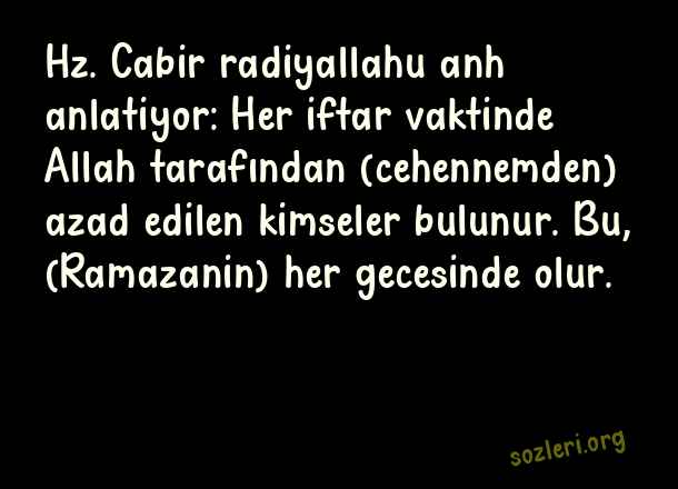 Hz. Cabir radiyallahu anh anlatiyor: Her iftar vaktinde Allah tarafından (cehennemden) azad edilen kimseler bulunur. Bu, (Ramazanin) her gecesinde olur. ( Ramazan İle İlgili Güzel Sözler )