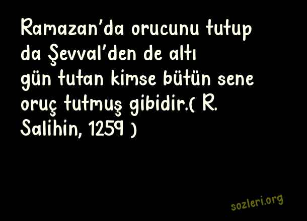 Ramazan’da orucunu tutup da Şevval’den de altı gün tutan kimse bütün sene oruç tutmuş gibidir.( R. Salihin, 1259 ) ( Ramazan İle İlgili Güzel Sözler )