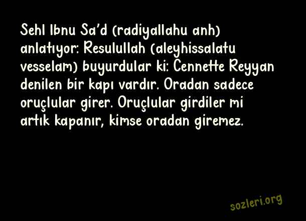 Sehl lbnu Sa’d (radiyallahu anh) anlatıyor: Resulullah (aleyhissalatu vesselam) buyurdular ki: Cennette Reyyan denilen bir kapı vardır. Oradan sadece oruçlular girer. Oruçlular girdiler mi artık kapanır, kimse oradan giremez. ( Ramazan İle İlgili Güzel Sözler )