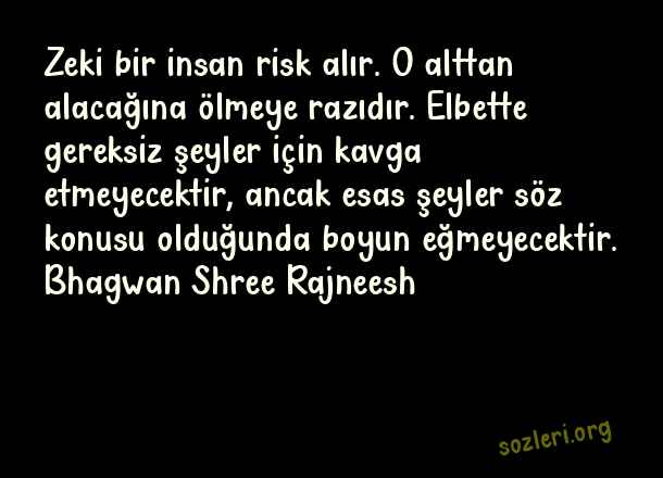 Zeki bir insan risk alır. O alttan alacağına ölmeye razıdır. Elbette gereksiz şeyler için kavga etmeyecektir, ancak esas şeyler söz konusu olduğunda boyun eğmeyecektir. Bhagwan Shree Rajneesh ( Risk )