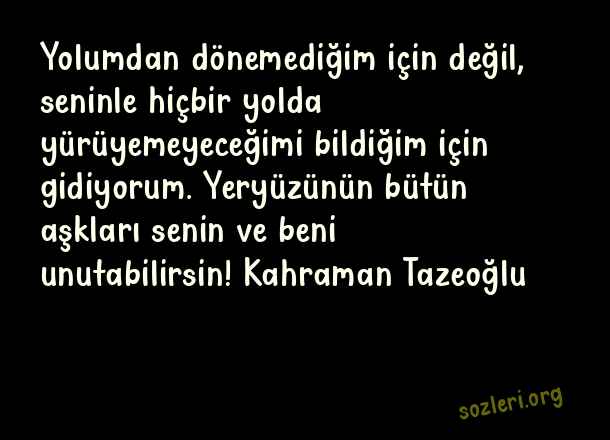Yolumdan dönemediğim için değil, seninle hiçbir yolda yürüyemeyeceğimi bildiğim için gidiyorum. Yeryüzünün bütün aşkları senin ve beni unutabilirsin! Kahraman Tazeoğlu ( Romantik Aşk )