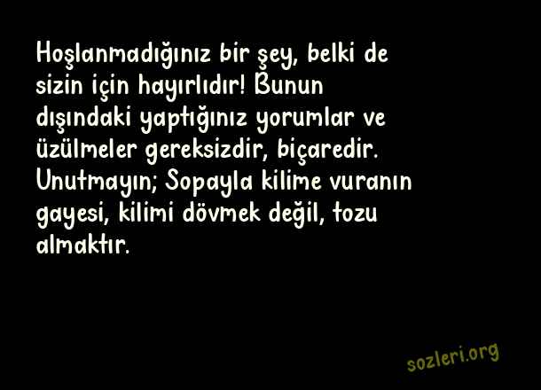 Hoşlanmadığınız bir şey, belki de sizin için hayırlıdır! Bunun dışındaki yaptığınız yorumlar ve üzülmeler gereksizdir, biçaredir. Unutmayın; Sopayla kilime vuranın gayesi, kilimi dövmek değil, tozu almaktır. ( Mevlana’nın Sabıri )