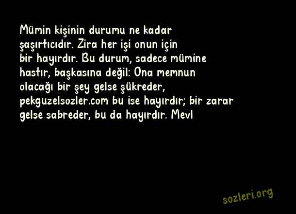 Mümin kişinin durumu ne kadar şaşırtıcıdır. Zira her işi onun için bir hayırdır. Bu durum, sadece mümine hastır, başkasına değil: Ona memnun olacağı bir şey gelse şükreder, bu ise hayırdır; bir zarar gelse sabreder, bu da hayırdır. Mevl ( Sabır )