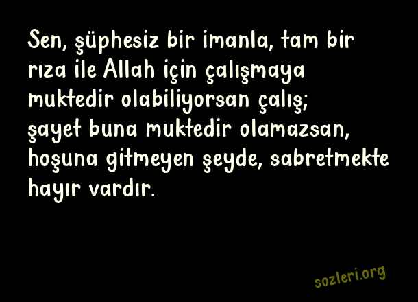 Sen, şüphesiz bir imanla, tam bir rıza ile Allah için çalışmaya muktedir olabiliyorsan çalış; şayet buna muktedir olamazsan, hoşuna gitmeyen şeyde, sabretmekte hayır vardır. ( Mevlana’nın Sabıri )