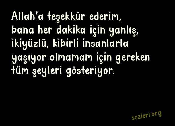 Allah’a teşekkür ederim, bana her dakika için yanlış, ikiyüzlü, kibirli insanlarla yaşıyor olmamam için gereken tüm şeyleri gösteriyor. ( Sahtekar İnsanlara Sözler )