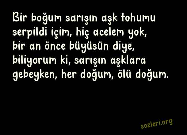 Bir boğum sarışın aşk tohumu serpildi içim, hiç acelem yok, bir an önce büyüsün diye, biliyorum ki, sarışın aşklara gebeyken, her doğum, ölü doğum. ( Sarışınlara Sözler )