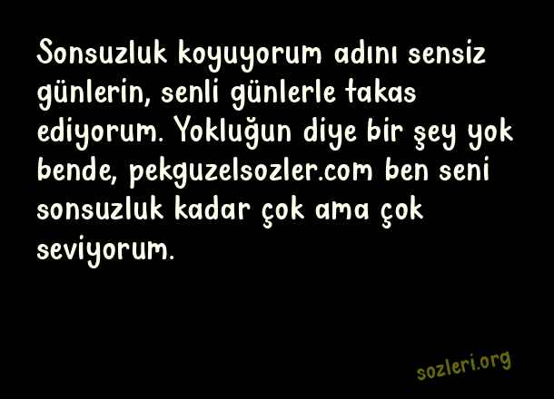 Sonsuzluk koyuyorum adını sensiz günlerin, senli günlerle takas ediyorum. Yokluğun diye bir şey yok bende, ben seni sonsuzluk kadar çok ama çok seviyorum. ( Sarışınlara Sözler )