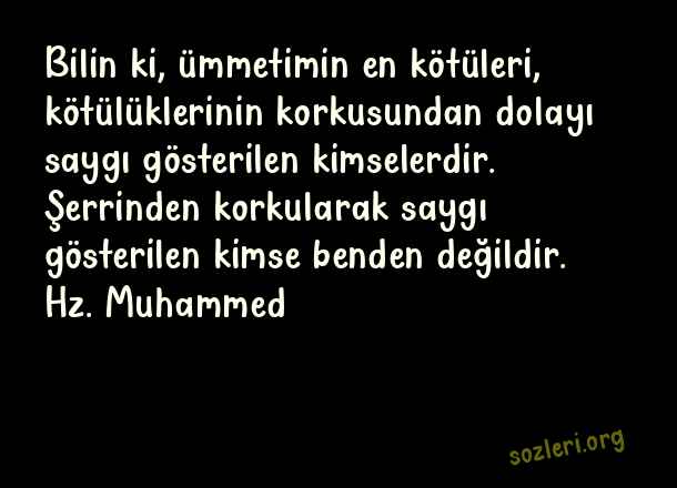 Bilin ki, ümmetimin en kötüleri, kötülüklerinin korkusundan dolayı saygı gösterilen kimselerdir. Şerrinden korkularak saygı gösterilen kimse benden değildir. Hz. Muhammed ( Saygısızlık )