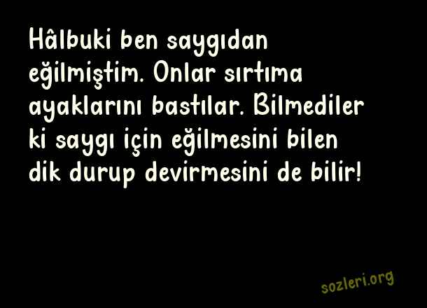 Hâlbuki ben saygıdan eğilmiştim. Onlar sırtıma ayaklarını bastılar. Bilmediler ki saygı için eğilmesini bilen dik durup devirmesini de bilir! ( Saygı )