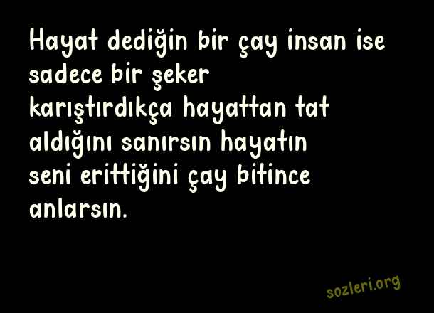 Hayat dediğin bir çay insan ise sadece bir şeker karıştırdıkça hayattan tat aldığını sanırsın hayatın seni erittiğini çay bitince anlarsın. ( Şeker Sözler )