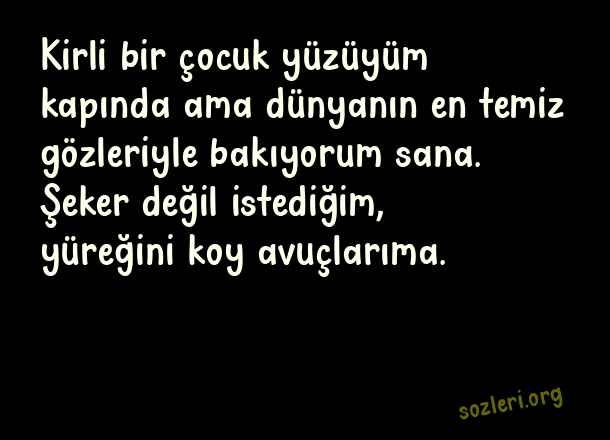 Kirli bir çocuk yüzüyüm kapında ama dünyanın en temiz gözleriyle bakıyorum sana. Şeker değil istediğim, yüreğini koy avuçlarıma. ( Şeker Sözler )
