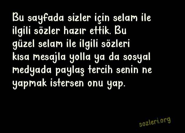 Bu sayfada sizler için selam ile ilgili sözler hazır ettik. Bu güzel selam ile ilgili sözleri kısa mesajla yolla ya da sosyal medyada paylaş tercih senin ne yapmak istersen onu yap. ( Selam )